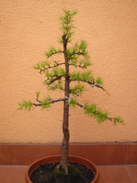 Foty przedstawiają modrzewia po pierwszym wstępnym zadrutowaniu. Zostawiłem w spokoju większość obocznych pędów, ponieważ drutowałem, gdy pąki były już nabrzmiałe i wolałem nie ryzykować.