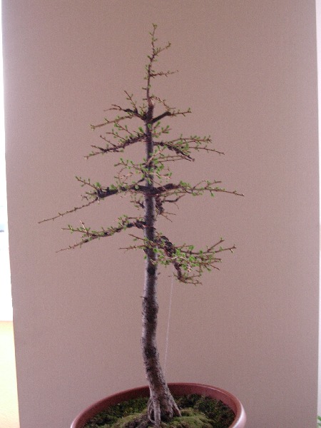 Chokkan jest wbrew pozorom bardzo trudnym stylem. Jego trudność polega właśnie na tym , że pień ma zwężać się ku górze i być idealnie prosty. Gałęzie powinny rozchodzić się promieniście na całym pniu na różnych poziomach. Wszelkie wygięcia i zaburzenia tak rozumianej harmonii są "błędem". Teraz trzeba zadać sobie pytanie czy część pnia z przegięciem jest na tyle rażąca, aby zdyskredytować całe drzewko? Moim zdaniem nie. Ponieważ i tak wszystko co najlepsze jest dopiero przed naszymi drzewkami to zostawmy tą część i skoncentrujmy się na koronie. Modrzewie mają duże przyrosty dzięki czemu ładną koronę można stworzyć w 3-4 sezony. Teraz popracowałbym właśnie nad koroną. Czym będzie lepsza tym mnie uwagi będzie przyciągł pień. Opukiwanie pnia może spowodować nienaturalne zgrubienie na tej wysokości i dopiero wtedy byłaby katastrofa. Jak roślina poradzi sobie z tą częscią? Zobaczymy za 5-8 lat. Bardzo możliwe , że przyrastający na grubość pień w jakimś stopniu pochłonie tą "wadę". Mam kilka drzewek z etapu kiedy zaczynałem z bonsai, których nie przekreślam mimo popełnionych błędów. Zapomniane często pozytywnie zaskakują po kilku latach.