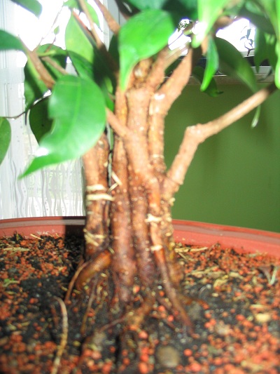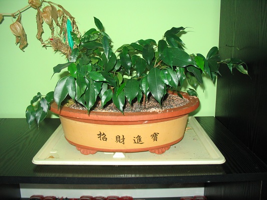 Co zrobić z kilkoma sadzonkami benjamina, gdy wszystkie "patyki" się przyjęły? wsadziłem je do jednej doniczki i związałem rafią.