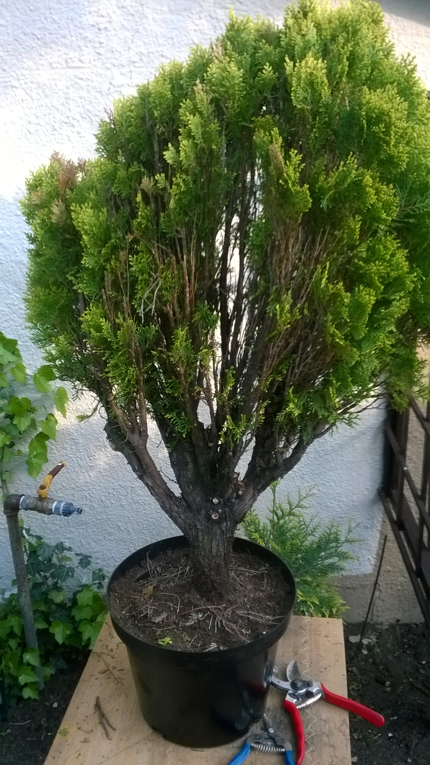Thuja to dość trudny do prowadzenia jako bonsai gatunek a ty zacząłeś od dość starego materiału niestety nigdy nie przygotowywanego pod bonsai. Wykonałeś pierwsze srogie cięcia które co prawda roślina powinna przeżyć ale wydaje mi się że bez przekonania lub pomysłu na przyszłość. Może za kilka lat będzie można coś wycisnąć więcej na razie musi się z powrotem zagęścić.